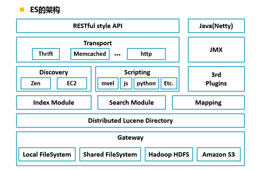 districted lucene directory之上就是一些es的模块,Index Module是索引模块,就是对数据建立索引也就是通常所说的建立一些倒排索引等;Search Module是搜索模块,就是对数据进行查询搜索;Mapping模块是数据映射与解析模块,就是你的数据的每个字段可以根据你建立的表结构通过mapping进行映射解析,如果你没有建立表结构,es就会根据你的数据类型推测你的数据结构之后自己生成一个mapping,然后都是根据这个mapping进行解析你的数据;River模块在es2.0之后应该是被取消了,它的意思表示是第三方插件,例如可以通过一些自定义的脚本将传统的数据库(mysql)等数据源通过格式化转换后直接同步到es集群里,这个river大部分是自己写的,写出来的东西质量参差不齐,将这些东西集成到es中会引发很多内部bug,严重影响了es的正常应用,所以在es2.0之后考虑将其去掉。